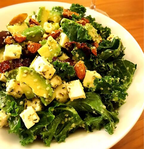 ケールの葉、フェタチーズ、アーモンド、ヘンプシード、アボカド、ブラックオリーブ、ドライトマトのオイル漬けを買って混ぜたら、レモン汁と白ワインビネガーで味付け。 塩気はオリーブとフェタチーズで十分出してくれます。 今日は近所のローカルマーケッ…
