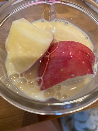 りんご半分に、冷やしておいた豆乳を注ぎ… りんごと豆乳のスムージー!! リンゴの風味って好きやわぁ〜。 豆乳はこれを1本使えば、タンパク質12.5グラム取れます 夏に気軽に栄養補給できるひんやりドリンク リンゴの皮にたっぷりあるファイトケミカルと、タ…